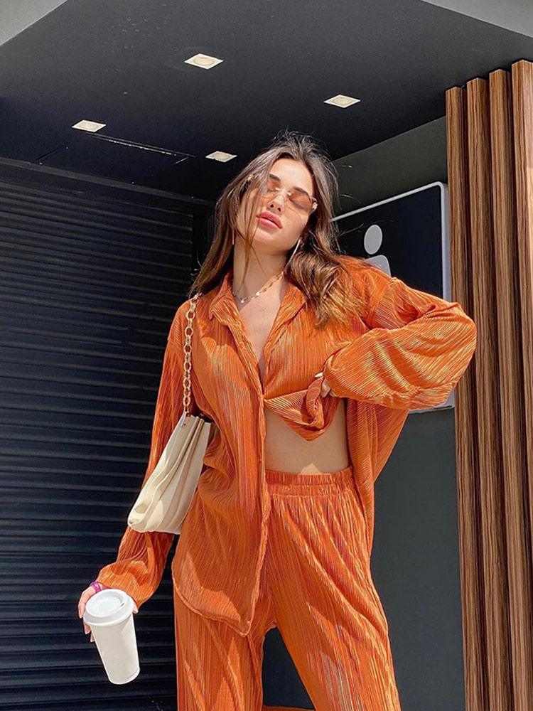 Spring Women's Shirt Pleated Two Piece Set Loose High Waist Wide Leg Pants Suit Casual Elegant Office Ladies Female Outfit