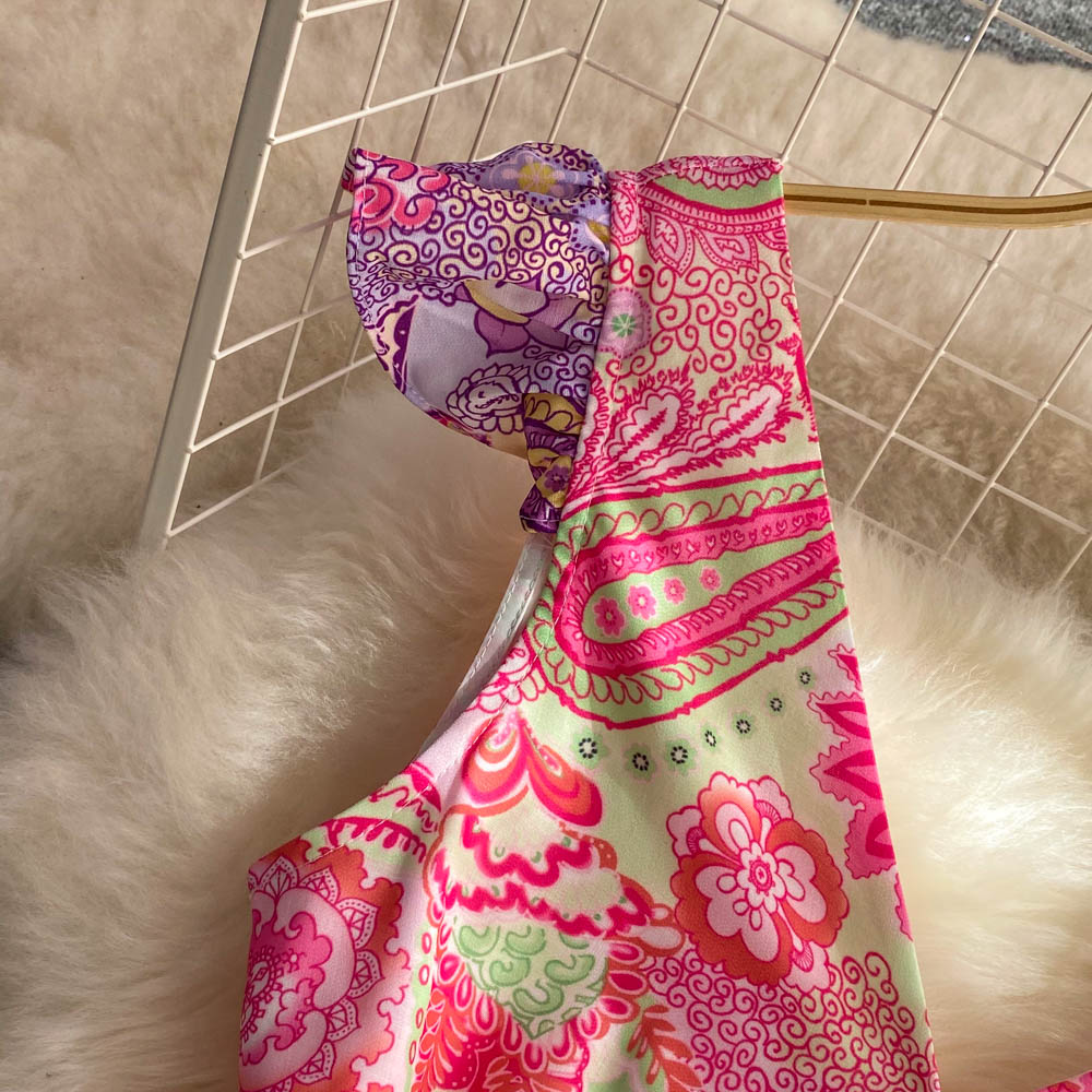 Summer Beach Cascading Ruffles Cake Dress Runway Women's V-Neck Sleeveless Flower Printed Holiday Party Long Robes Vestidos