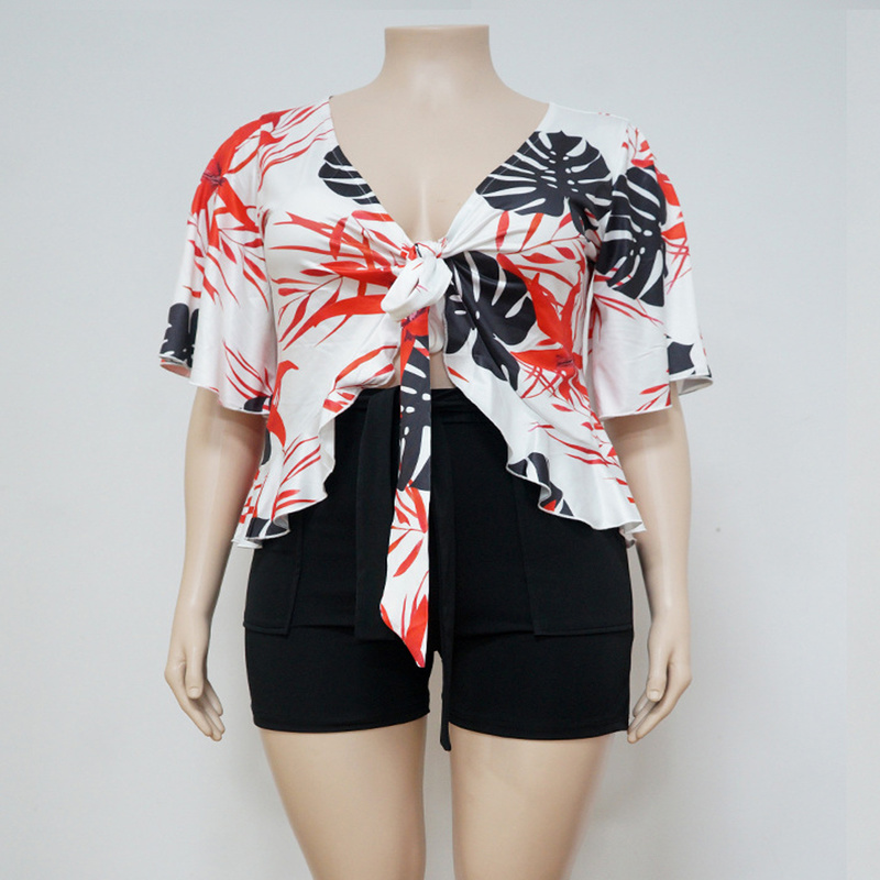 Summer Plus Size Women Clothing Two Piece Set 4xl WholeItems Sexy V Neck Bandage Print Tops Casual Shorts Sets Wholesale