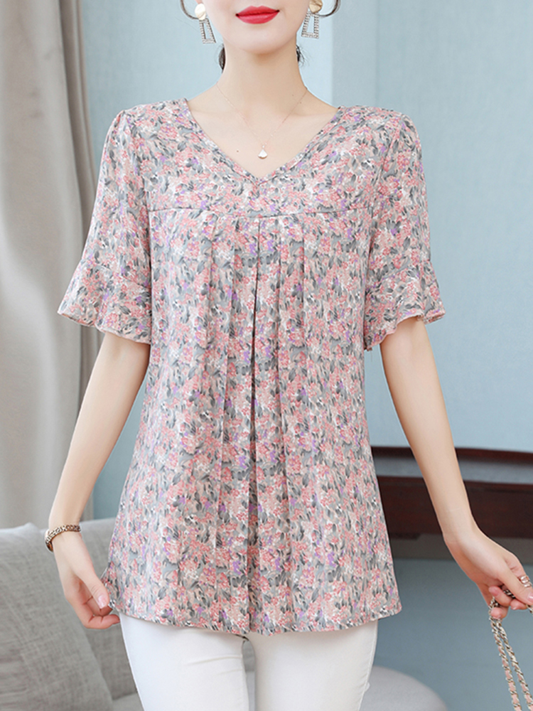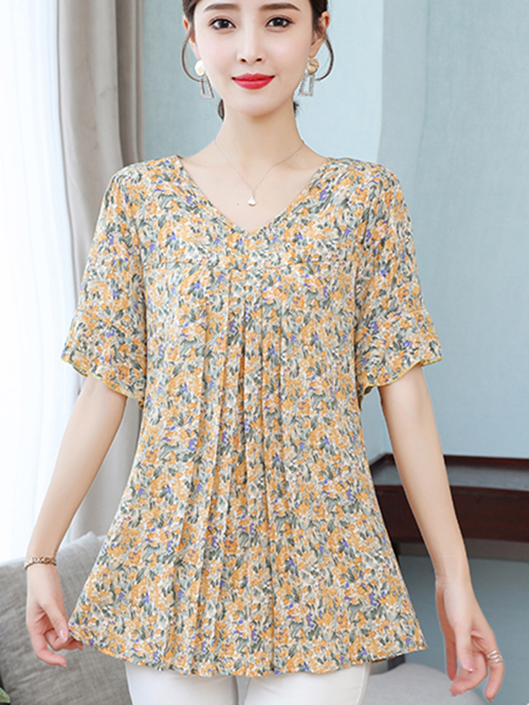 Summer Women's Tops Short Sleeved Ladies Blouse V-Neck Large Size Loose Top Chiffon Shirt Folds Casual Print Blouses Blusas