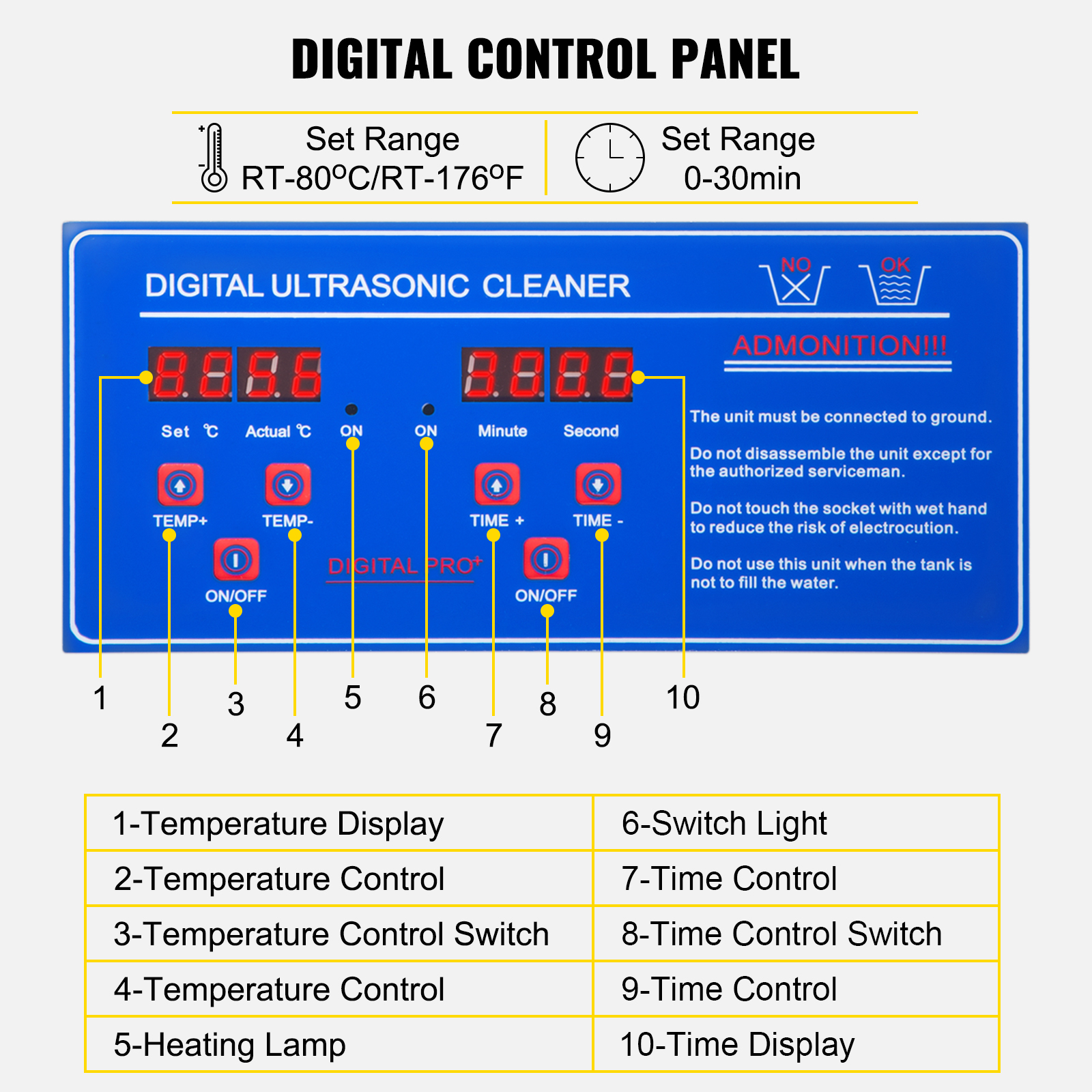 【DIGITAL CONTROL PANEL】 - The jewelry cleaner ultrasonic machine features a digital control panel, with an adjustable timer (0-30 min) and heater (RT-176℉/RT-80℃) displayed on LED. A heating function can effectively soften and dissolve oil and wax stains, thereby improving the cleaning effect.