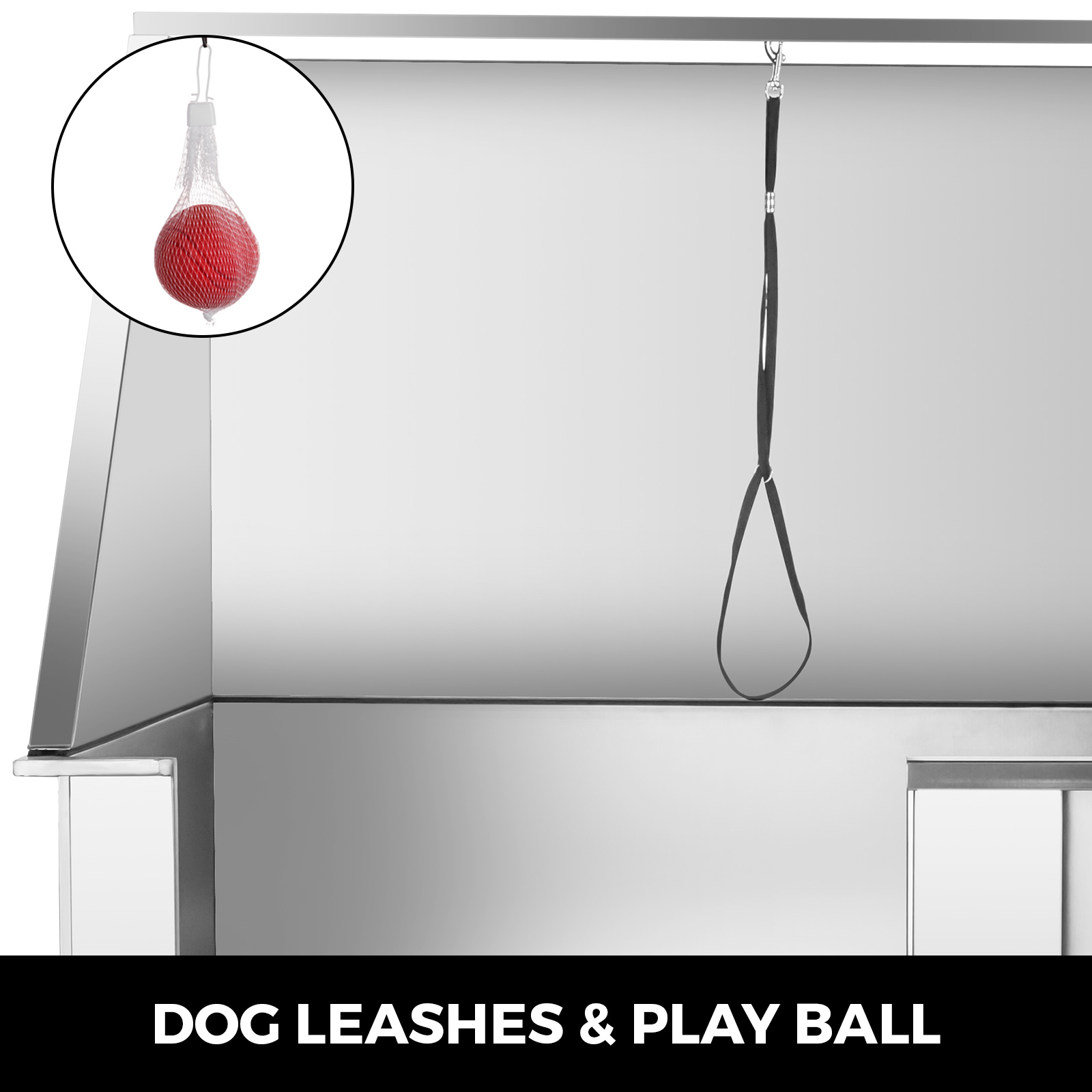 Two fixing ropes are for tying dogs at bathing in the dog bath tub and keep them from running. The red play ball is coming as a gift for keeping pets occupied and make bathing more pleasant.