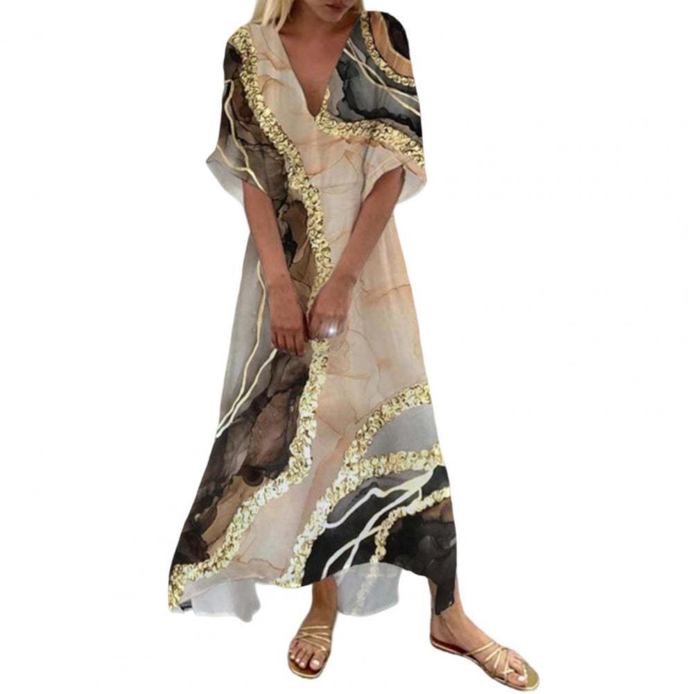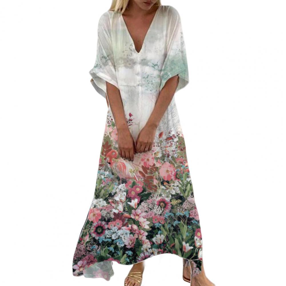 V-Neck Half Sleeve Large Hem Elegant Dress Vivid Flower Printing Ladies Loose Maxi Dress Female Clothing