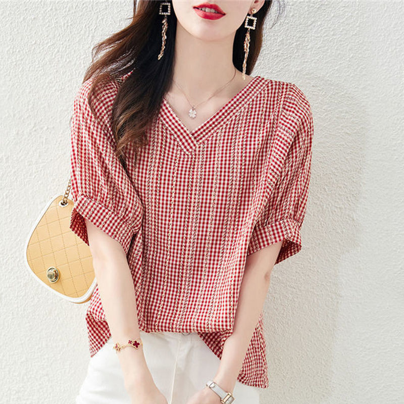 Vintage Printed Plaid V-Neck Oversized Puff Sleeve Shirt Summer Casual Pullovers Commute Women's Clothing Loose Blouse