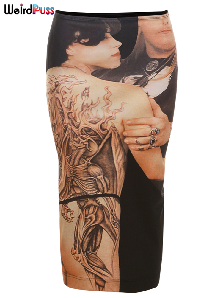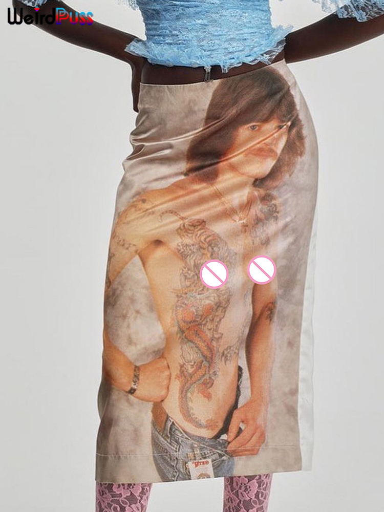 Weird Puss Straight Skirt Body Print Women Low Waist Navel Wild Casual Streetwear Party Stretchy Skinny Clothing