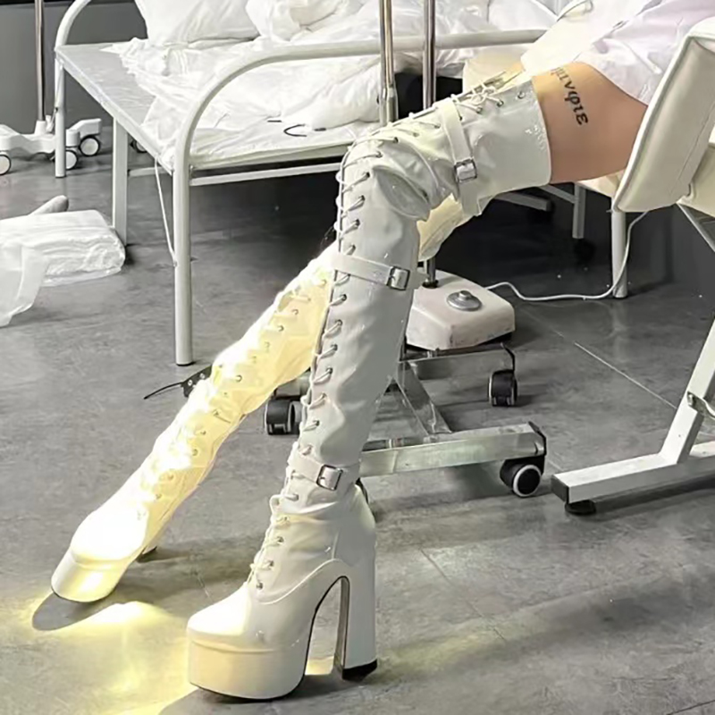 White Patent Leather Lace Up Round Head Platform Chunky High Heel Over The Knee Boots Solid Narrow Band Buckle Women'sshoes