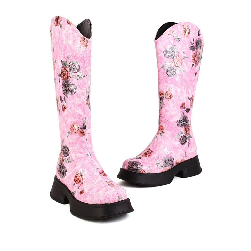 Woman Knee High Boots Trend Winter Retro Round Head Small Platform Women Shoes Casual Mid Heel Print Boots