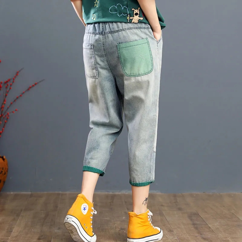Women Jeans Summer High Waist Patch Denim Cropped Pants Female Elastic Waist Embroidered Color Matching Harem Pants A67
