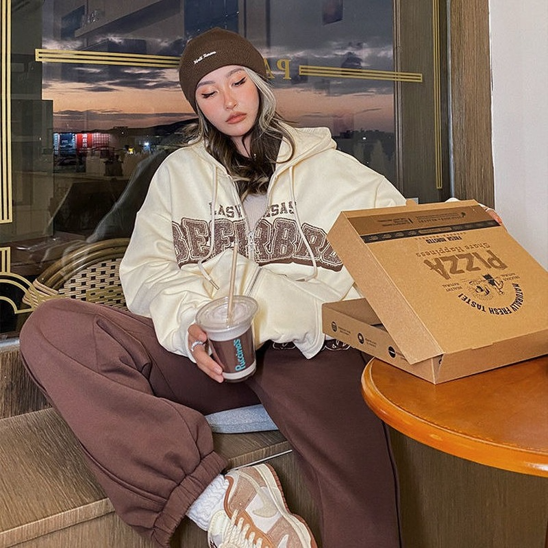 Women Letter Print Hoodies Autumn Winter Retro Loose Zip Up Hooded Sweatshirts Female Casual Long Sleeve Sweatshirt Coats