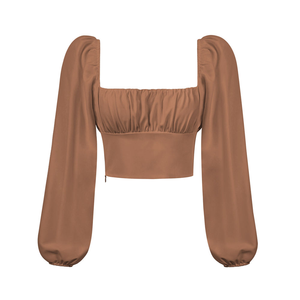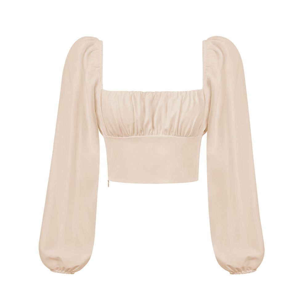 Women Slash Neck Blouse Ladies Girls Long Puff Sleeve Folds Waist Backless Short Shirt Female Crop Clothes