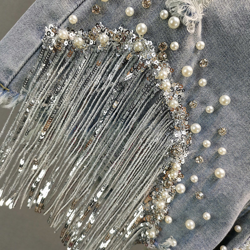 Women Spring Summer Elegant Shorts Lady Tassel Beading High Waist Wide Leg Denim Shorts Female Casual Solid Shorts