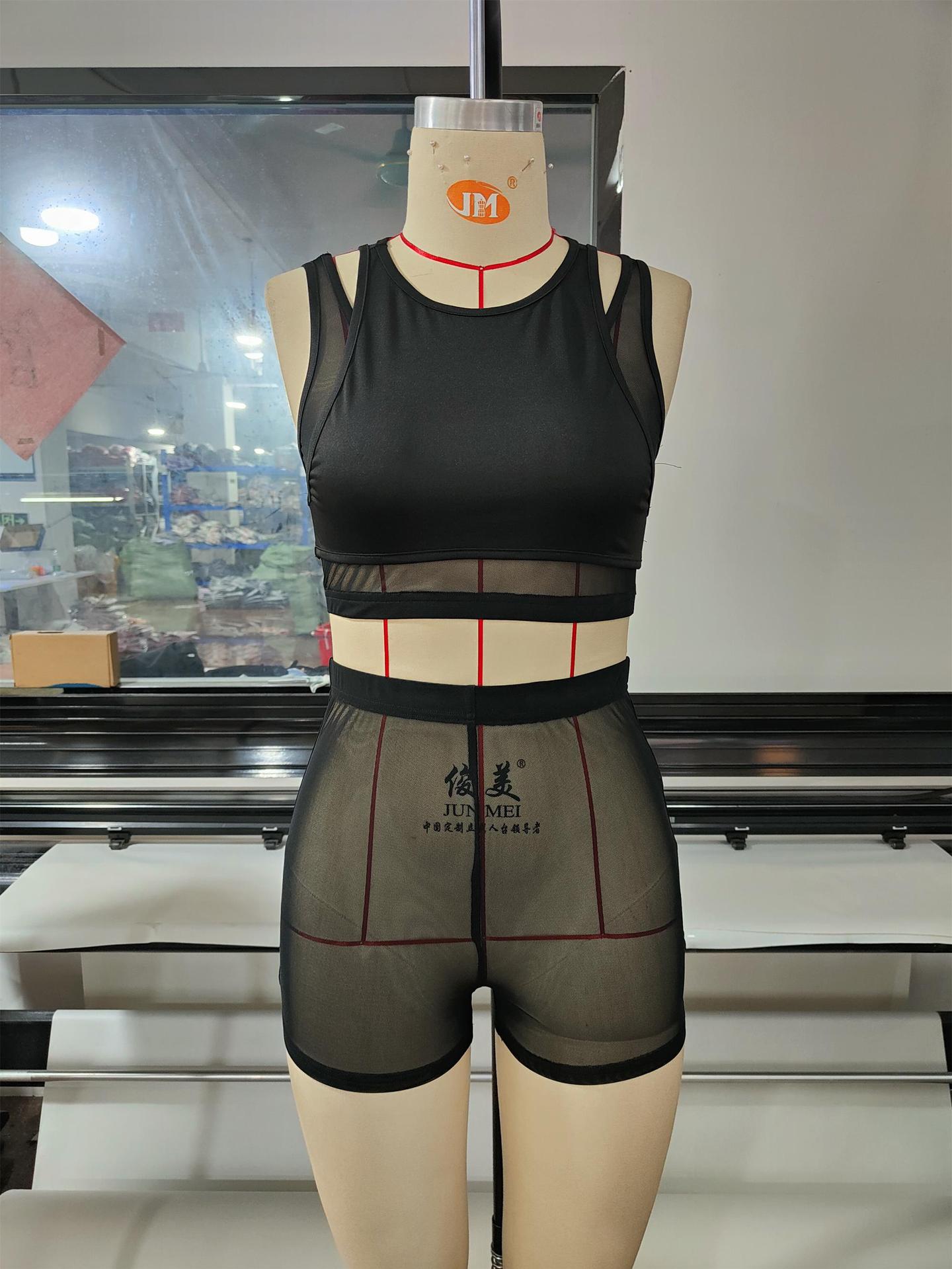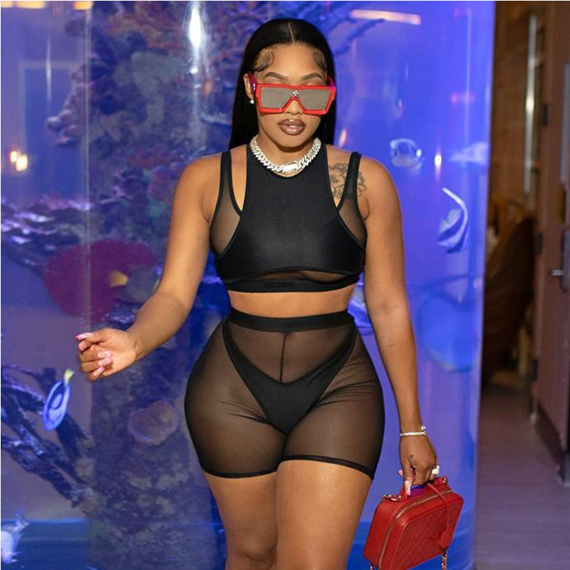 Women Summer Sexy Sheer Mesh Sleeveless Tank Crop Top + Shorts See Through Club Party Tracksuit Outfits Casual Black 2 Piece Set