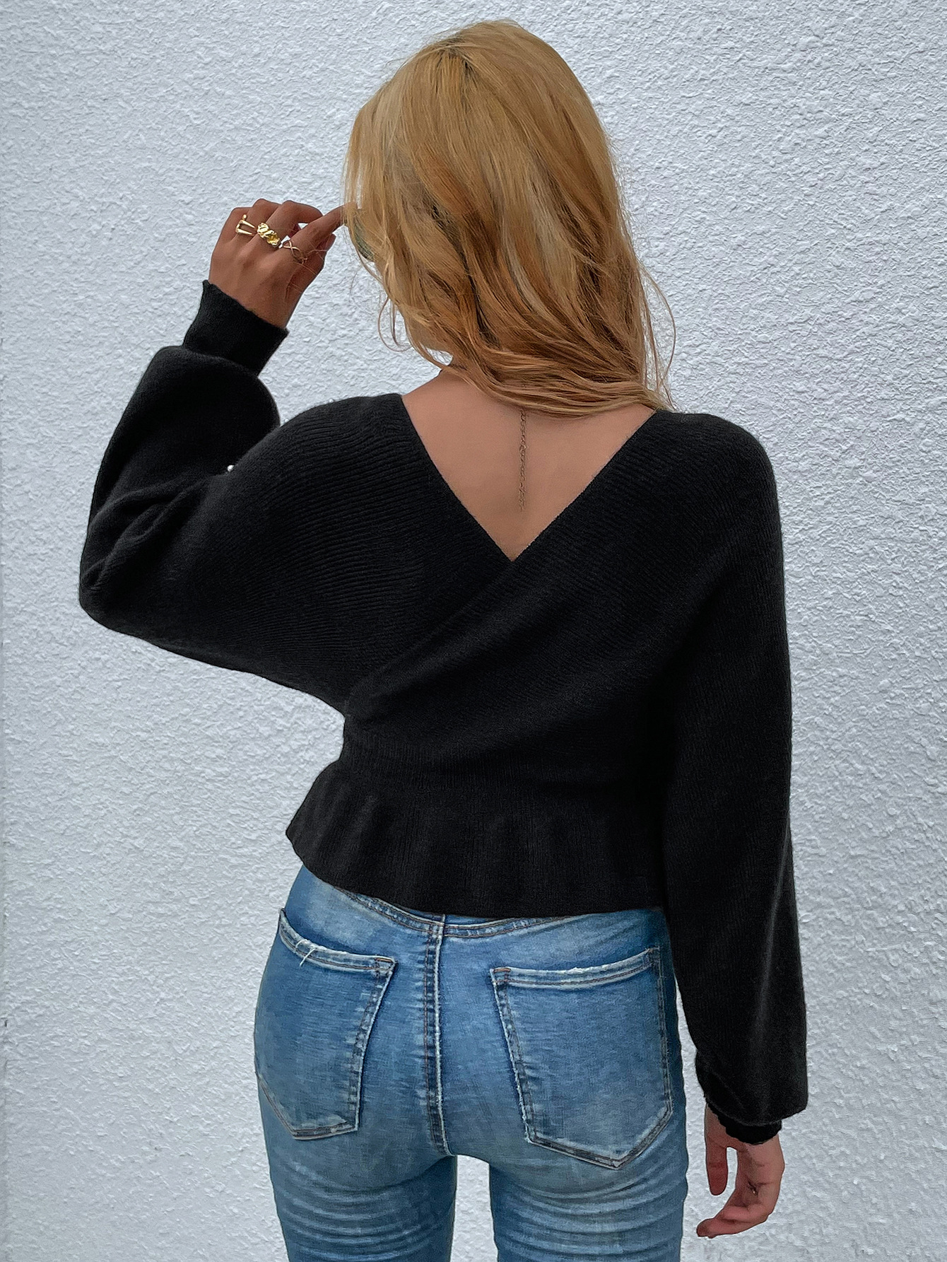 Women's Autumn And Winter Sweater Front And Rear V-neck Nail Bead Pullover Bat Sleeve Lady's Short Top