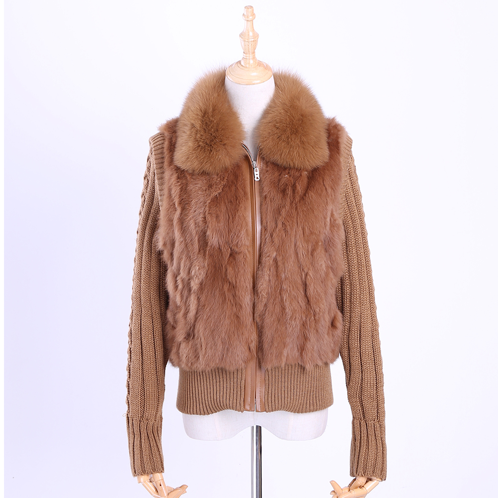 Women's Genuine Real Rabbit Fur Fox Fur Collar Knitting Sleeve Women's Winter Coat Fur Jacket Casual Short Outwear Slim