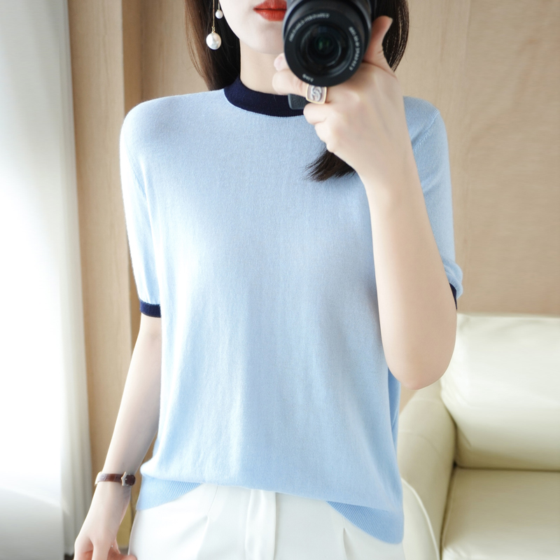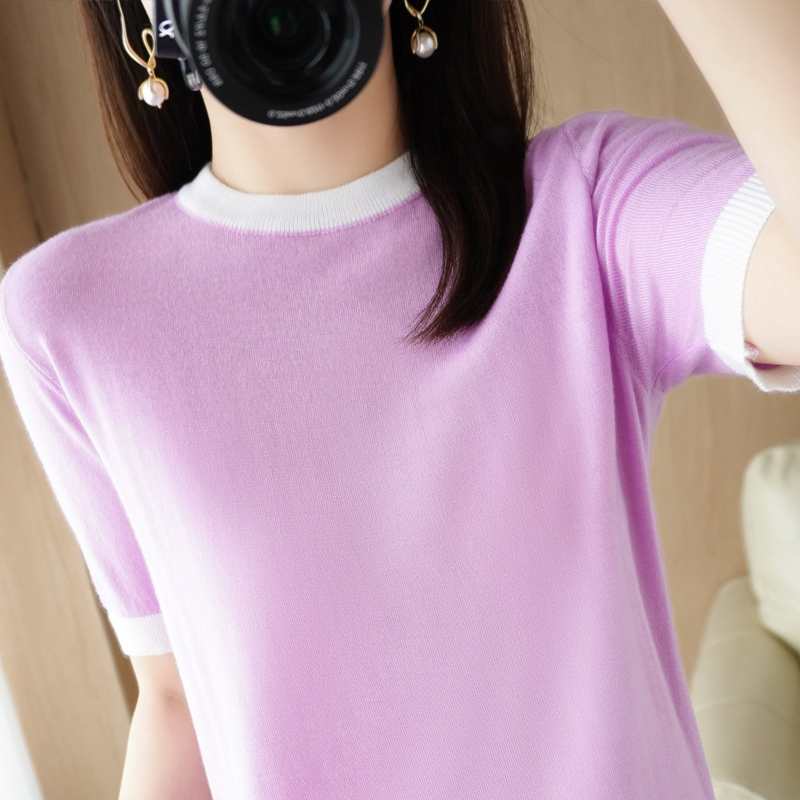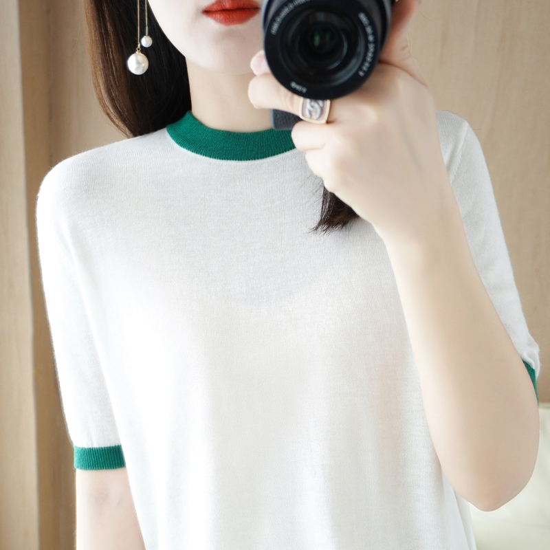 Wool Knitted Color-Blocking Short-Sleeved Women's Summer Mid-Sleeve Slimming Design Niche T-Shirt Bottoming Shirt Top