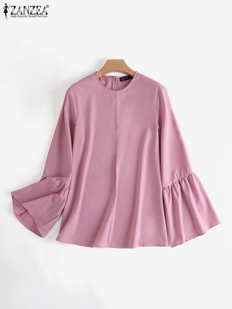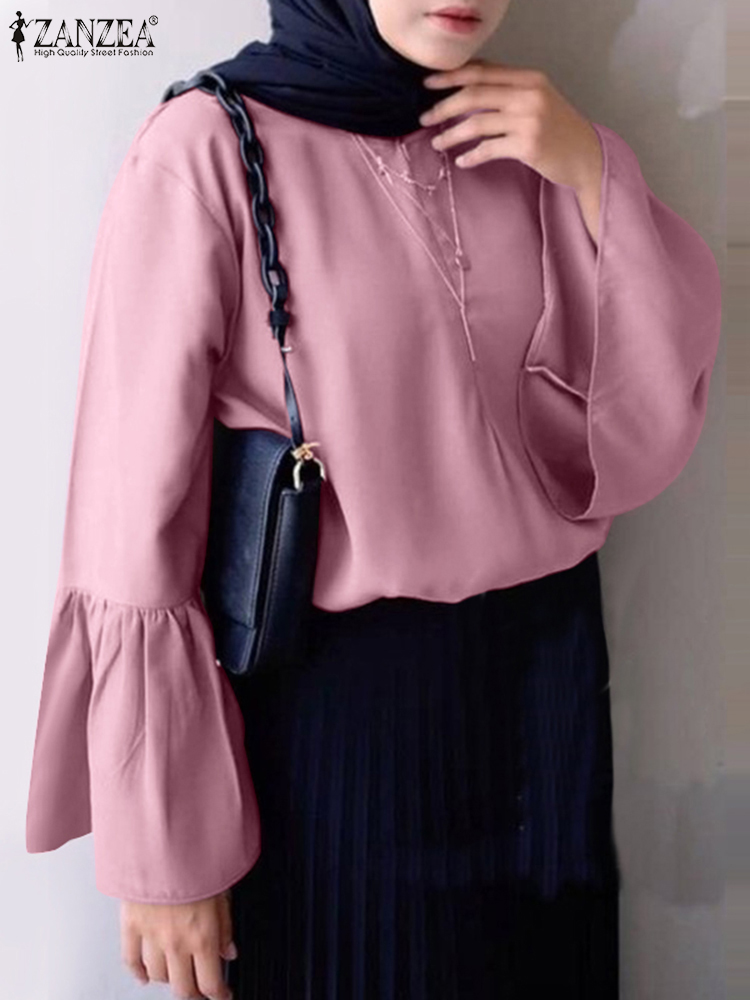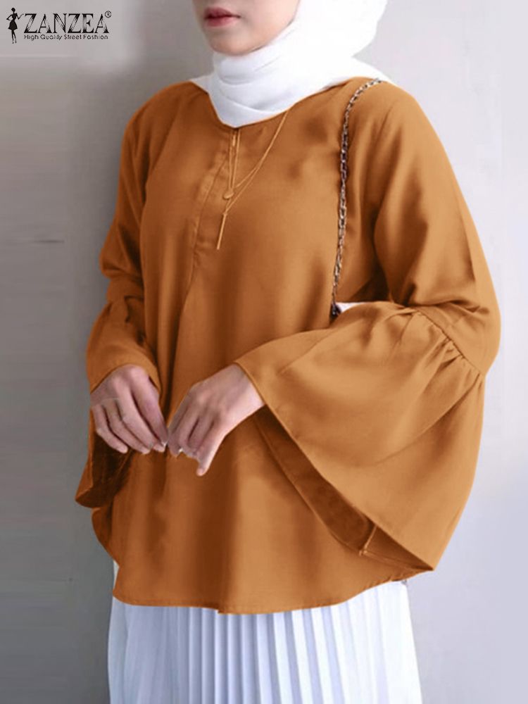 ZANZEA Muslim Stylish Holiday Elegant Casual Abaya Kaftan Dubai Islamic Clothes Women Blouse O-Neck Flare Sleeve Solid Tops