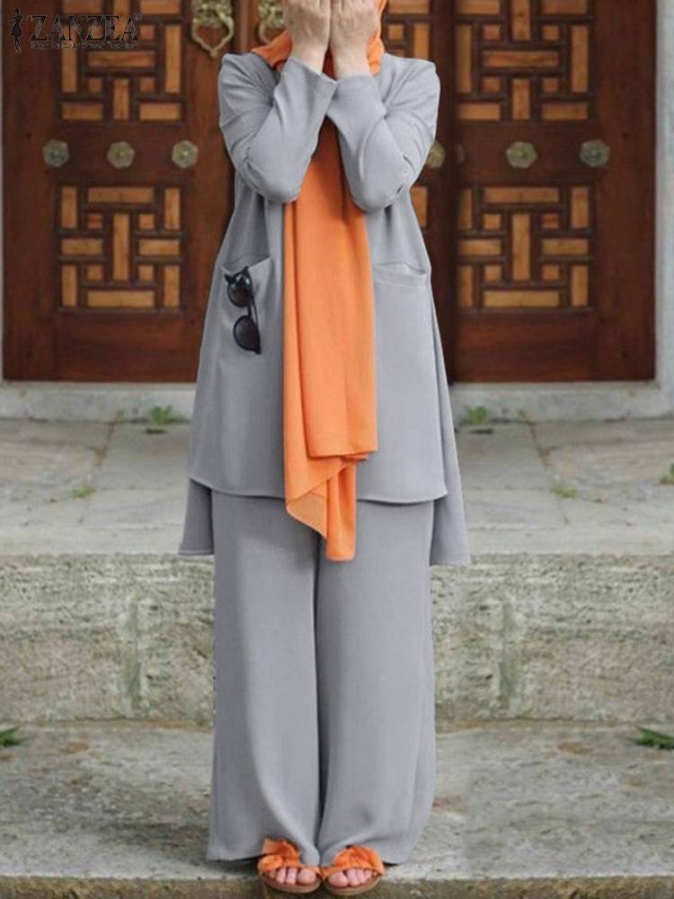 ZANZEA Women 2PCS Casual Abaya Hijab Tracksuit Vintage Muslim Pant Sets Summer Long Sleeve Blouse Suits Loose Matching Sets