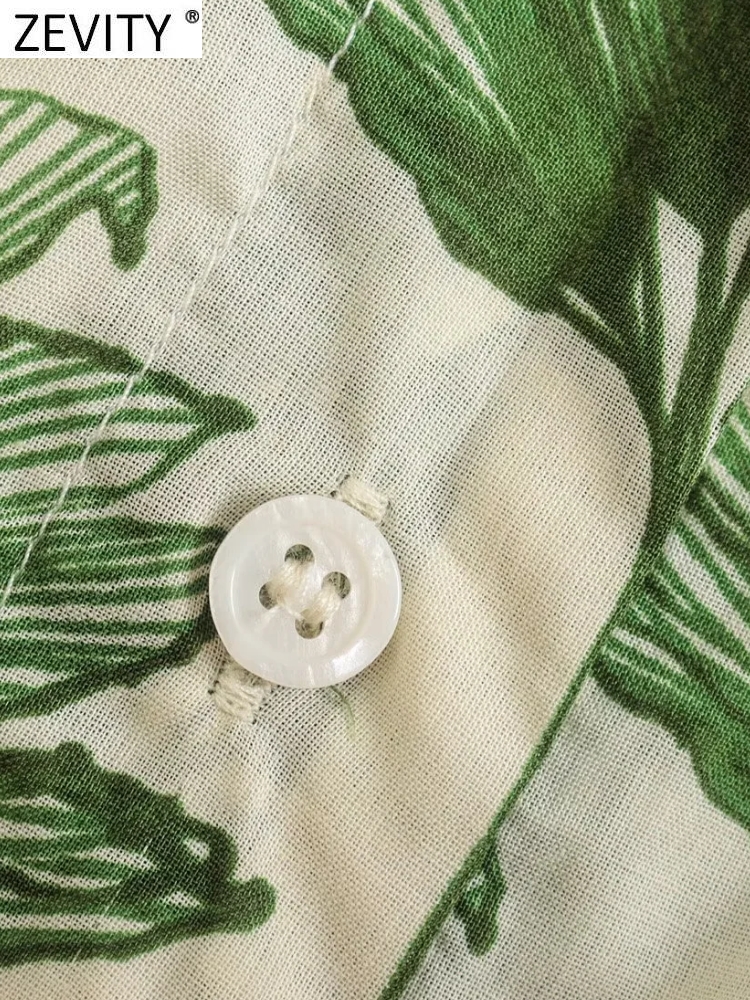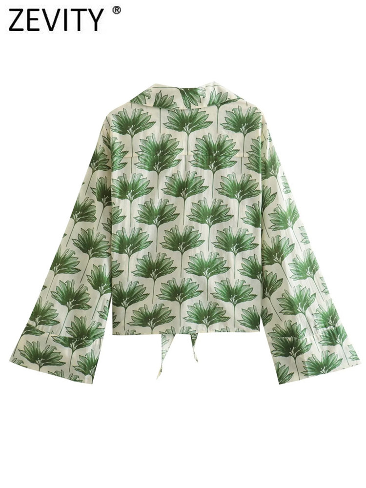 Zevity Women Vintage Green Leaves Floral Print Hem Knotted Smock Blouse Female Breasted Shirt Chic Chemise Blusas Tops LS2016