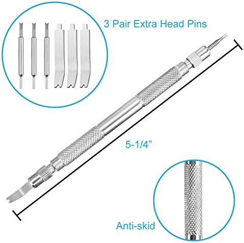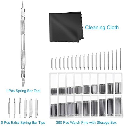 Anezus watch tools with watch link removal tool and watch pins are solidly made. The watch kit link remover with 6 replacement tips is handy and easy to use. The whole watch pin tools are great for removing watch bands, changing watch straps, replacing watch bracelets, repairing watches and fixing jewelry. Spring bars tool: Material: stainless steel Quantity: 1 piece spring bar pin tool with extra 6 tips for replacement Color: silver Sizes: 5 3/8” x 5/16” in L & W Handle: heavy hurl handle for a sure grip. Use: large fork end on spring bar removal for strap and rubber diver band; Small fork end for removing lug spring bars from backside of metal band. Fit for: any brand watches. Spring bar pins: Material: stainless steel Quantity: 360 pieces Color: silver Sizes: 8 mm, 9 mm, 10 mm, 11 mm, 12 mm, 13 mm, 14 mm, 15 mm, 16 mm, 17 mm, 18 mm, 19 mm, 20 mm, 21 mm, 22 mm, 23 mm, 24 mm, 25 mm. 20 pieces for each size Package: place in a plastic slot box with size information on it Package Includes: - 1 x Spring bar tool - 6 x extra tips - 360 x watch pins - 1 x glasses cloth - 1 x plastic container case