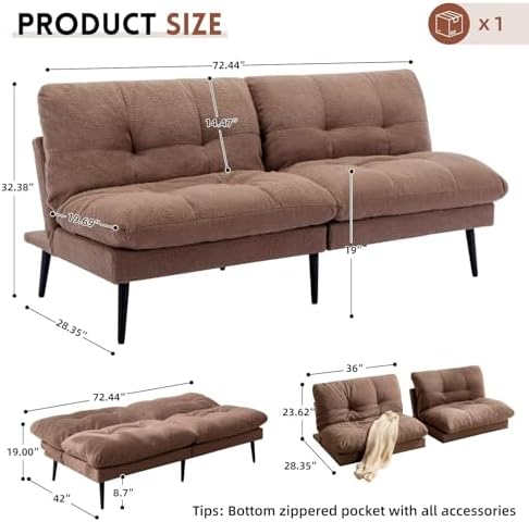- All the sofa legs & accessories are cleverly stashed in the futon's bottom zipper pocket