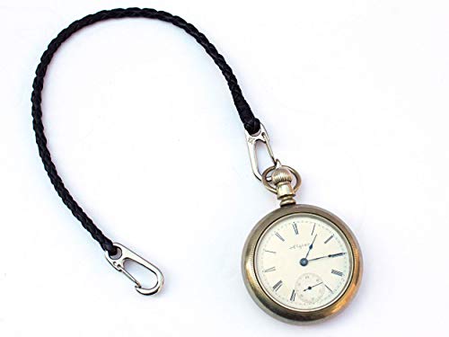 This is a very high quality leather pocket watch "chain", handmade in Oregon (I believe it was).More expensive, but well worth it.I also bought the "Hide & Drink" pocket watch holder (on Amazon) for my belt, and the pair fit together like they were made for each other.Photos tell the story.You can also loop this chain for attachment to a belt loop, or whatever.Love it, and it's quiet when I walk.