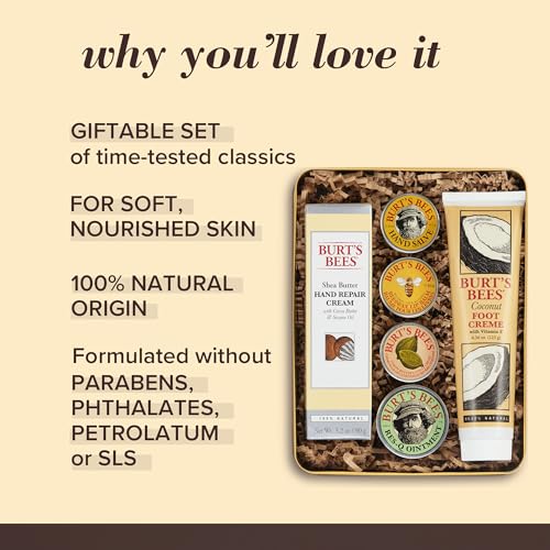 Revitalize and infuse your skin with moisture with Burts Bees Classic Gift Set. This 6 piece Classics set includes Lemon Butter Cuticle Cream to nourish and hydrate nails and cuticles; Coconut Foot Cream to pamper feet; Beeswax Lip Balm to replenish dry lips; Classic Hand Salve and Shea Butter Hand Repair Cream to nurture and moisturize dry hands; and to nourish and moisturize your dehydrated skin, a tin of Res-Q Ointment. Burts Bees Classics are time tested originals made with the finest ingredients from nature. Indulge your skin with these natural products formulated to help retain moisture and keep your skin soft and supple. This Burts Bees Classics Gift Set is the perfect birthday or holiday present for anyone on your list. The giftable tin is designed to be gift ready so you can skip the wrapping. Give the gift of nourishment with Burts Bees skin care.