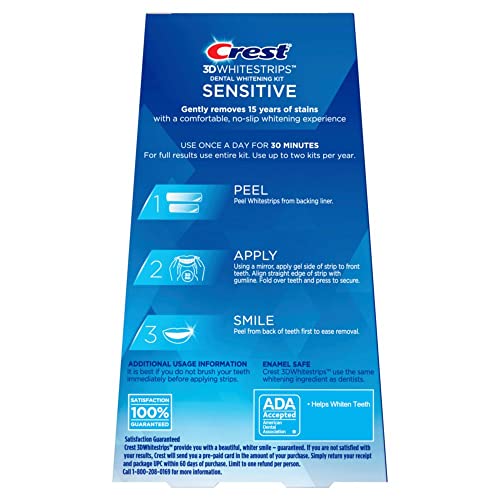 Looking for an at-home teeth whitening treatment designed for sensitive teeth? Choose Crest 3DWhitestrips Sensitive from the #1 dentist-recommended at-home teeth whitening brand. You can get a brighter, whiter smile in just 14 days with Crest 3DWhitestrips Sensitive 30-minute teeth whitening treatment. It is specially formulated for sensitive teeth and has been accepted by the American Dental Association. Using the same enamel safe whitening ingredient as dentists, you can get 100% noticeably whiter teeth, guaranteed. Plus, a comfortable no-slip grip helps the whitening strips stay put, so you can talk and drink water while whitening you teeth. Simply apply for 30 minutes a day for 14 days. This pack includes 36 teeth whitening strips, 18 for your top teeth and 18 for your bottom teeth, to be used over the course of 2 weeks.
