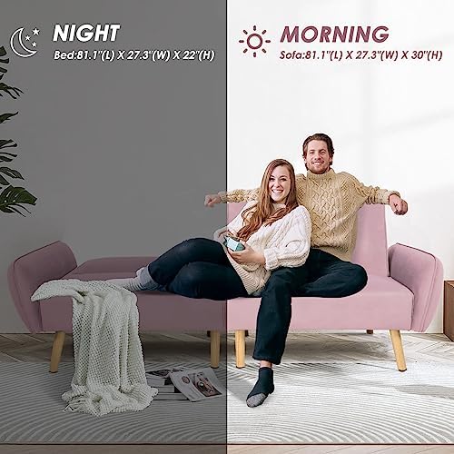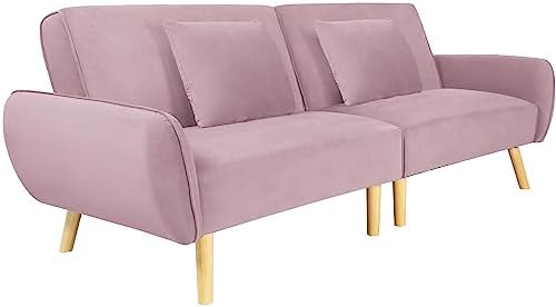 Crownland Futon Sofa Bed, Loveseat Sofa with Velvet Pillows, Mid-Century Modern Style Folding Sofa for Living Room, Bedroom, Apartment (Pink)
