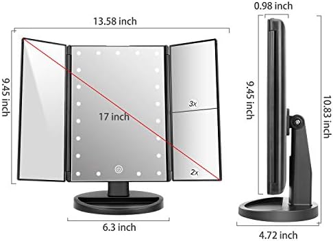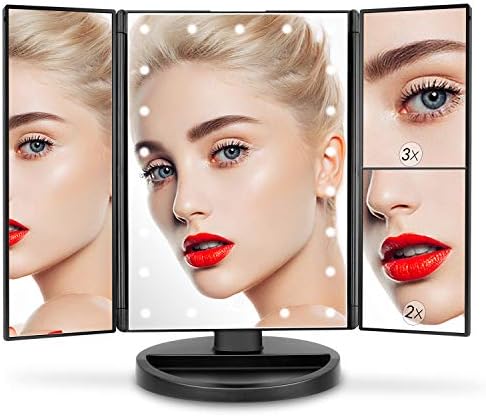 Great mirror. Easily portable and it has a touch light that is on the large middle mirror that is very bright and useful when powered by the USB cable. I have tried it with batteries as well (especially when I misplace the cable or am not near a plug-in/outlet) and the lights are not even half as bright as when it is plugged into an outlet. But that’s been the case for many different lights and electronic items that I have owned, so it’s not the mirrors fault by any means. The mirror is great and can be adjusted to a number of angles and degrees. The magnification in all the mirrors is crystal clear and quite wonderful if you ask me. I love the way it closes when not in use and it’s pretty compact so it can be stored away until needed. However the base/stand is an oval shaped bottom and I find myself more often Then not tipping the mirror over backwards due to the length and weight of the top of it (I want to literally lay it horizontal at times, and I can’t because it will just tip backwards. Every time. ) I understand why it does it and I admit it’s a little rare to find someone who wants to tilt it back as far as I do, but that doesn’t take away from the fact that it honestly tipsover and that I honestly believe it would be more stable and secure if the base was a square or rectangle and a little bigger in comparison to the degree at which it can tilt. Anyways, wonderful mirror, perfect image, beautiful magnifications, and sleek design. Very portable, useful, and lightweight. Basically exactly what I was looking for. Thank you.