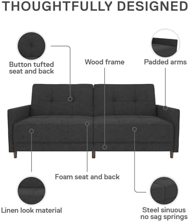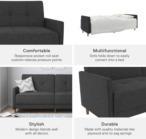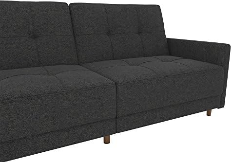 The mid century modern look is making a comeback in a big way, and we’ve captured it all here for you in our stunning and or a coil futon. The tufted upholstery gives this futon its unique charm, available in your choice black or white faux leather, as well as in grey or navy blue linen—perfect to fit your Home’s décor! plus the sleek wooden legs add to the sofa's style, with center legs designed to provide extra stability. The sofa's Secret is its split back design that allows guests to adjust their angle of comfort. So you can each sit up, lounge back or open up the space to lie flat. The independently encased coils are designed to offer complete comfort by day and extra support at night when your futon opens up for overnight guests. The and or a is small enough for tight living spaces while providing you with big style and comfort!.