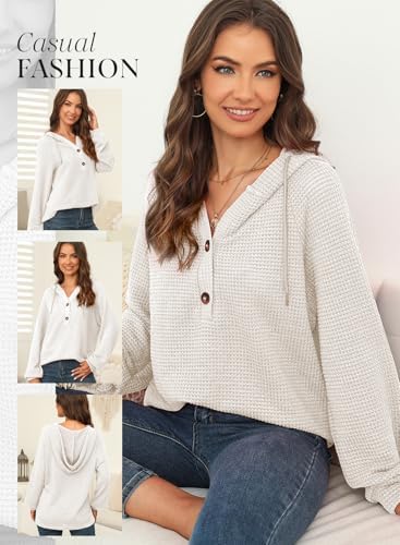Dokotoo Hoodies for Women Waffle Knit Drawstring Button Hooded Sweatshirt Tops