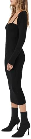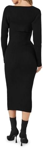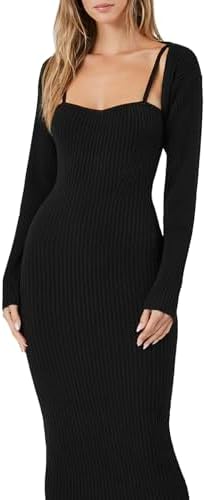 A ribbed knit set featuring a midi sweater dress with a sweetheart neckline, cami straps, straight-cut back, and bodycon silhouette, as well as a matching shrug with dropped long sleeves.