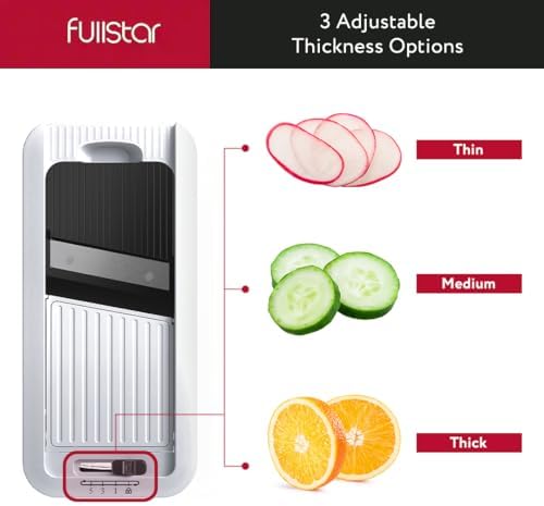 The Fullstar All-in-1 Vegetable Chopper, Mandoline Slicer & Cheese Grater is a game-changing tool that will revolutionize your kitchen experience. This versatile gadget combines multiple functions into one compact and efficient device, making meal prep a breeze.What sets this kitchen tool apart is its unparalleled versatility. With interchangeable blades and attachments, you can effortlessly chop, slice, and grate a variety of fruits, vegetables, and cheeses with precision and ease. From perfectly diced onions to uniformly sliced cucumbers, this chopper delivers professional-quality results in seconds.I particularly appreciate the safety features of the Fullstar All-in-1 Vegetable Chopper. The included handguard ensures your fingers stay safe while slicing and dicing, giving you peace of mind during food preparation. Plus, the non-slip base keeps the chopper securely in place on your countertop, preventing accidents and spills.Cleanup is a breeze with this kitchen tool. All components are dishwasher safe, making it easy to maintain hygiene and cleanliness after use. The compact design also makes storage a breeze, taking up minimal space in your kitchen cabinet or drawer.Whether you're a seasoned chef or a beginner in the kitchen, the Fullstar All-in-1 Vegetable Chopper is sure to become your go-to tool for effortless food preparation. Say goodbye to tedious chopping and slicing and hello to quick, easy, and delicious meals every time!Unfortunately, it is not perfect, sometimes food get stuck in the blades and are hard to clean!