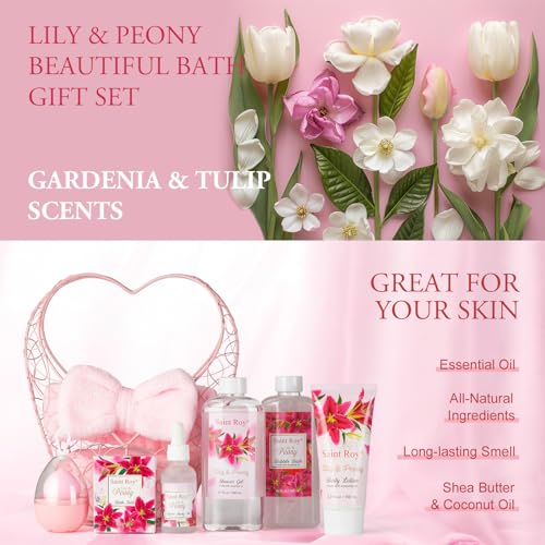 Gift Basket For Women, 8pcs Spa Set of Lily & Peony Home Spa Set, Beauty Personal Care Set Includes Jojoba Essential Oil, Spa Self Care Kit - Bath Body For Thank You, Birthday, Mom, Anniversary Gift
