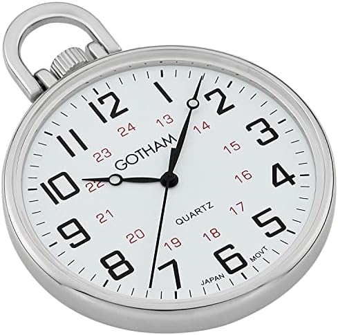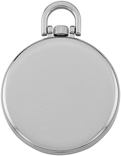 This highly polished silver-tone open face ultra thin pocket watch is the perfect addition to anyone's timepiece collection. Features include a bright white dial with an easy to read railroad style dial with black numbers, detailed 24 hour inner track and antique style hands. The precision Japanese quartz movement never needs winding so you will always be on time. Also included is a 14 inch deluxe curb link chain with belt clip attachment. This beautiful pocket watch will arrive in an attractive velour burgundy gift pouch then boxed in gift packaging that does not need wrapping. As always, operating instructions and our hassle free lifetime limited warranty are enclosed. It's Gotham time..