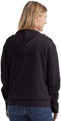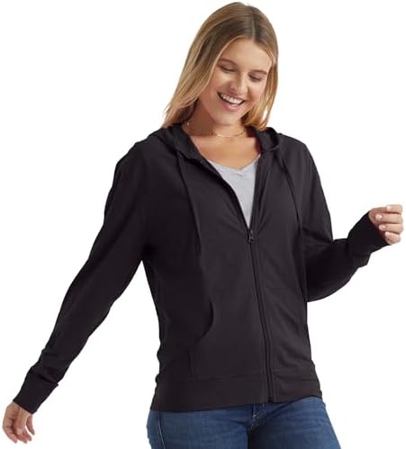 Part t-shirt, part pullover hoodie, part zip-up jacket. When you want that athletic hoodie look without the warmth or bulk of fleece, this Hanes® women's lightweight zip-up hoodie has you covered. The lightweight design is crafted from soft slub cotton jersey for a distinctively uneven texture. (Dada Grey Heather is a cotton/rayon/polyester blend.) A sturdy dyed-to-match front zipper allows for easy-on and easy-off. You can count on classic hoodie details like wide cuffs and waistband, roomy kanga split pockets, and a drawcord hood for ultimate comfort. Layer this hoodie over your favorite tee or pair it with some sweats for a casual-cool style.