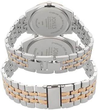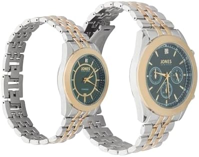 Elevate your style with the Jones New York shiny two-tone metal bracelet analog watch set, a fusion of timeless sophistication and contemporary elegance. Crafted with meticulous attention to detail, these watches exude luxury and refinement, perfect for discerning couples. The men's watch features a bold 42mm case, complemented by a 22mm band width, while the women's counterpart boasts a delicate 34mm case and a 17mm band width, ensuring a perfect fit for both partners. With case thicknesses of 10mm and 8mm for men and women respectively, and total lengths of 8 inches and 7.75 inches, these watches are meticulously designed to grace the wrists of couples with unparalleled grace and style. Each watch proudly showcases the iconic jones new york brand name on its dial, accompanied by a dazzling diamond delicately placed at 12 o'clock using a miracle setting, adding a touch of opulence and sophistication. The round-shaped and shiny silver case create a captivating visual contrast, further accentuated by the bezel's shiny gold-tone finish, evoking a sense of luxury. The green metal alloy sunray dial adds a unique and stylish touch to the design, while the flat glass crystal ensures durability and clarity, enhancing the watches' overall aesthetic appeal. Index markers adorn the dials, providing both elegance and functionality, while the fold-over clasp ensures a secure and comfortable fit for all-day wear. Notably, the men's watch features three chronograph sub dials, adding versatility and functionality to the design. Whether worn individually or as a set, the Jones New York analog watch set is the perfect gift for couples, symbolizing love, companionship, and timeless elegance.