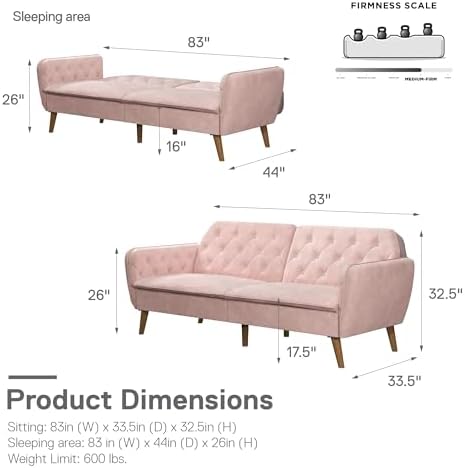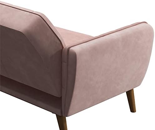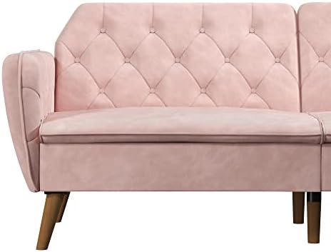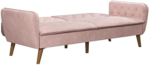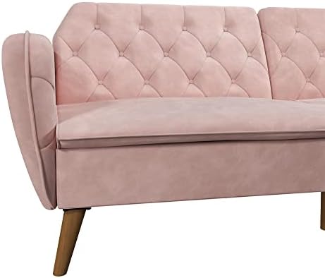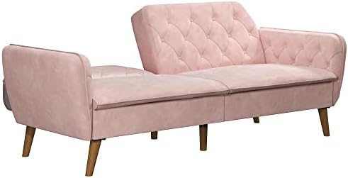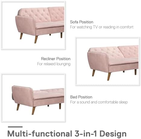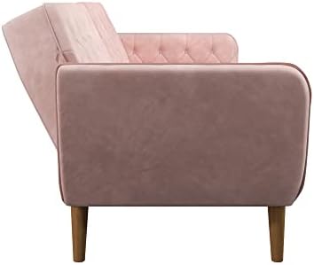 The Novogratz Tallulah Memory Foam Futon is exactly what you need and more! Bringing elegance and sophistication into your home with its vintage silhouette, rounded lines and button-tufted details. Designed with a soft velvet upholstery, this piece of furniture is both compact and multi-functional. Made with a sturdy wood frame, the Tallulah Memory Foam Futon is designed to offer nothing but superior comfort! The seat cushions are filled with high-density foam and responsive memory foam that will cradle your body to help relieve pressure points while you are watching TV or taking a much needed afternoon nap. The backrest features a split-back design that can be independently reclined to convert between multiple positions: sitting, lounging and sleeping. In other words, this means that you will now have an extra bed for overnight guests! Available in multiple colors, the Novogratz Tallulah Memory Foam Futon is finished with slanted wooden legs to add a last touch of chic style!