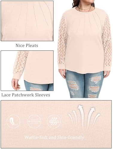 OLRIK Plus Size Tops for Women Lace Long Sleeve Waffle Knit Shirts Casual Loose Fit Blouse (1X-4X)
