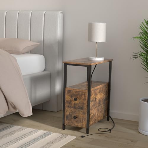We recently got a king size bed and needed to downsize our bedside table.This one is great!It's nice and skinny, but offers 2 drawers, as well as 2 flat surfaces to store your stuff.The outlet part is so wonderful and convenient.Well made, sturdy, and doesn't look cheap.Easy to assemble.I did it on my own and I am by no means "handy".
