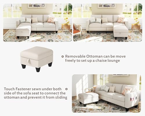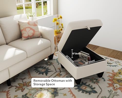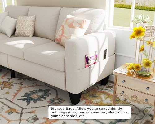 This small sofa of Woyomeub is perfect for living room, apartment, dorm and other small rooms where space is limited. Measuring 78" x 29" x 33", this sectional couches provides you with seating space for 3 people. Thoughtfull ideals of storage on ottoman and side bags provide storage space for small blankets, games, small toys, and other small items. Provides you with additional seating space while providing some space for organizing. Specification: Product: Sectional sofa Dimension: 78×29×33 inches / 198×73.5×82 cm Weight: 105 lbs Seating Capacity: 3 seater sofa Fabric: Linen; Velvet Color: Beige, Grey Cushion: Detachable Padding: Foam; Fibre Storage: Yes Sofa Cover: Zipped, detachable