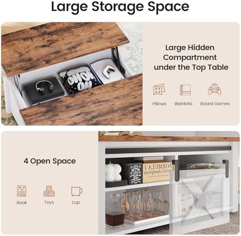 Our farmhouse coffee table provides a large storage space up to 27*14.5*16.1 inches. A hidden storage compartment keeps your everyday items like pillows, blankets, laptop, books, board games handy and dirt-free.