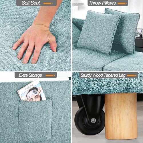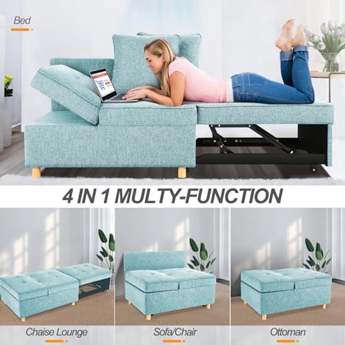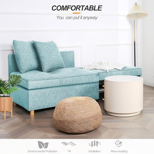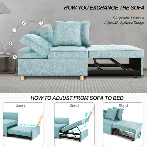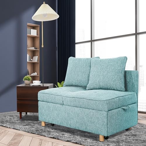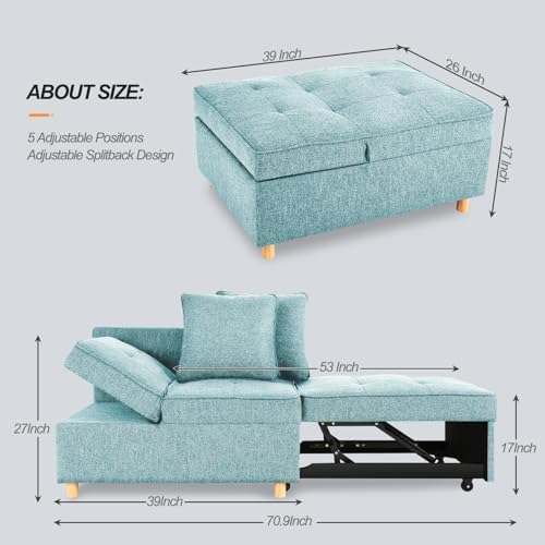 This sleeper sofais a great space-saving option for small apartments, dorm rooms or home offices. While it performs well as a compact loveseat or ottoman during the day, it easily folds out to a single bed for overnight guests.The light blue upholstery has a modern, clean-lined look that will fit into most decor styles. It also has adjustable backrests and armrests for customizable comfort while seating two.As with many futon-style couch beds, this one is quite firm and not the most cushiony seat. However, for the price and versatility in a tight space, it's difficult to beat. The fold-out mattress is comfortable enough for one person to sleep on.Overall, this 4-in-1 futon couch/ottoman/loveseatis a practical furniture piece that saves space without compromising functionality. Its transformable design makes it suitable for small living quarters like apartments, dorms or home offices.