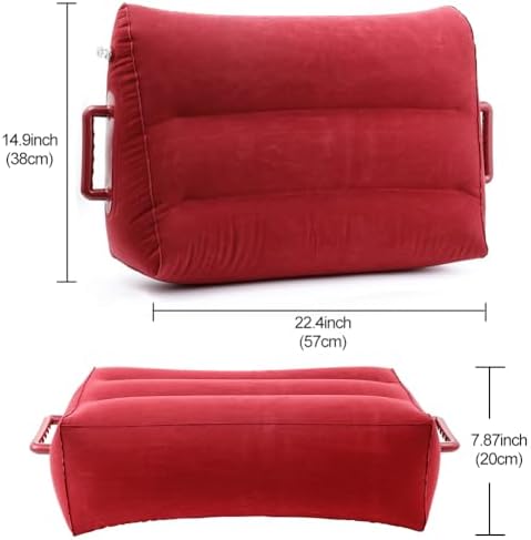 This inflatable pillow offers more comfort for some positions and is easy to set up with just a few deep breaths of air.It has a standard pool inflatable valve that you have to squeeze to let air in and out.The surface has a velvet like feel that is fairly soft but there are some scratchy feeling seams on the edges.The orange color I thought was strange at first but is a fun pop of color.I thought the handles would be kind of gimmicky but have come in handy for positioning of the pillow and better grip.