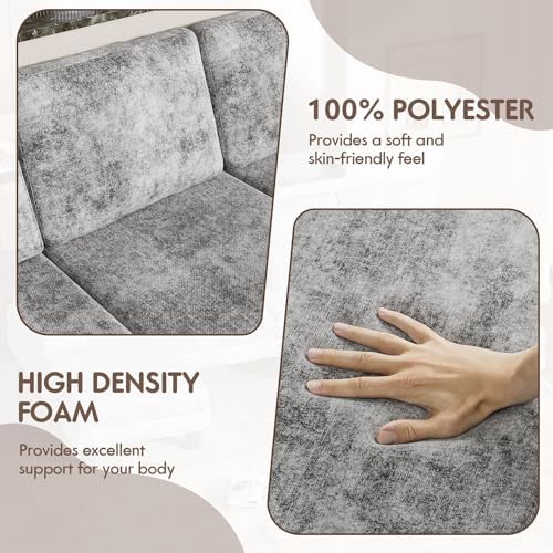 Shocking that all this couch came in three boxes under 70 pounds each. Assembly is straight forward enough. The footers feel a little cheap but actually connect nicely and seem to fit well. The cushions swell right up, once they’re removed from their vacuum sealed packaging. The chenille fabric and grey color feel nice and look great. The foam is a microfiber type foam so it’s supportive and firm.Overall a solid value. I’d buy again