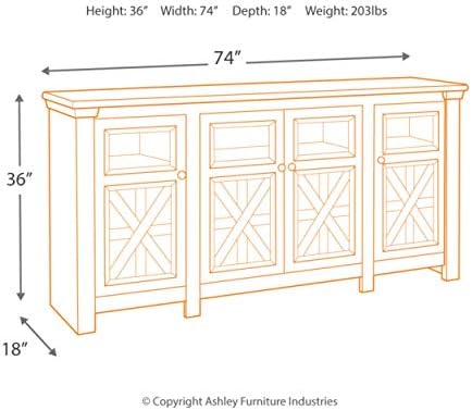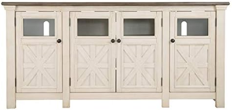 Whether your style is farmhouse fresh, shabby chic or country cottage, you’ll find this extra large TV stand perfectly in tune. Its two-tone, gently distressed finish pairs weathered oak with antique white for that much more quaint character. Charming elements include crossbuck adorned cabinets with glass inlays for peek-through flair. Ample adjustable shelving and cutouts for wire management nicely accommodate your media needs. A stylish TV stand can make your entertaining space a cozy place to relax and recharge. Our entertainment centers provide sturdy support for TVs and other electronics while hiding the wires and cords that could clutter your decor. Whether you're looking for mid-century, farmhouse or other styles, our furnishings include display and storage space, with open and closed-door compartments, drawers and adjustable shelving. And we go the extra mile to package, protect and deliver your purchase in a timely manner.