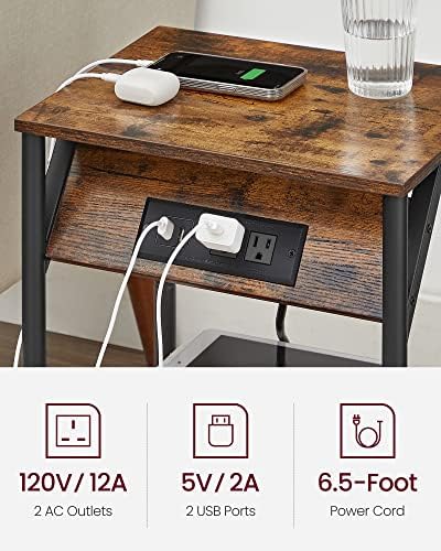 VASAGLE End Table with Charging Station, Set of 2, Small Side Tables for Living Room, Bedroom, Nightstand with Outlets and USB Ports, Bedside Table with Storage Shelf, Rustic Brown and Black