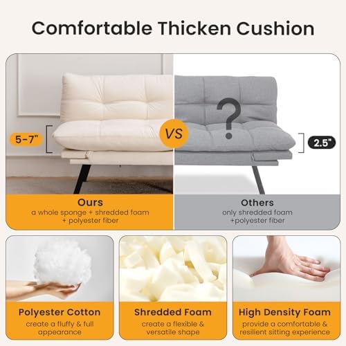 I couldn't be more thrilled with my purchase of this Velvet Convertible Futon Sofa Bed! It's everything I was looking for and more. Here’s why I’m giving it 5 stars:Comfort: The thick padded cushions are incredibly soft and comfortable, whether I’m sitting or lying down. It's perfect for lounging during the day or for a restful sleep at night. I was pleasantly surprised by how plush and supportive it is, especially given its compact size.Versatility: The adjustable backrest is a game changer! It's so easy to switch from a sofa to a bed, and I love how customizable the reclining angle is for both sitting and sleeping. Whether I’m reading, watching TV, or taking a nap, I can adjust it to my perfect comfort level.Style: The cream white velvet fabric looks absolutely gorgeous and adds a touch of elegance to my living room. It has a modern yet cozy feel that blends perfectly with my decor. It’s also soft to the touch and looks far more expensive than it actually is.Size & Space-Saving: The 71" loveseat size is just right for my apartment. It doesn’t take up too much space, yet it provides ample seating for two people. It's also a great option for a guest room or small living space, as it easily converts into a sleeper without overwhelming the room.Easy to Assemble: The futon was surprisingly easy to set up. It arrived well-packaged, and the instructions were clear. I was able to assemble it in under 30 minutes without any trouble.Overall, this futon is a fantastic blend of style, comfort, and practicality. I’m so happy with it and would highly recommend it to anyone looking for a comfortable, space-saving, and versatile piece of furniture. Perfect for any living room or bedroom!