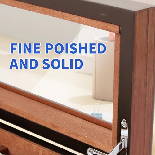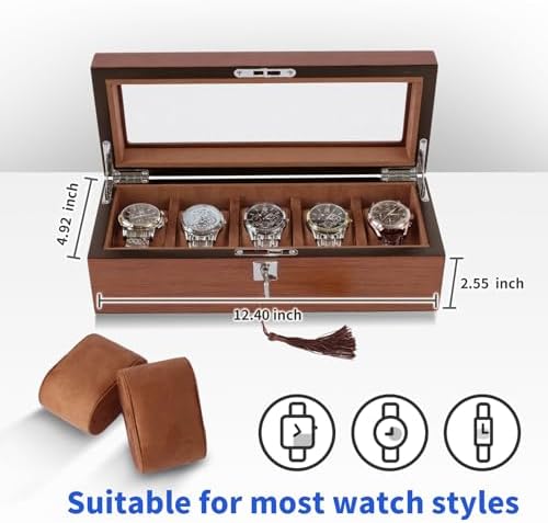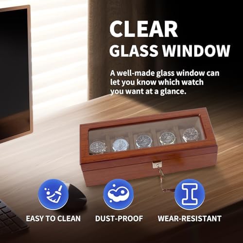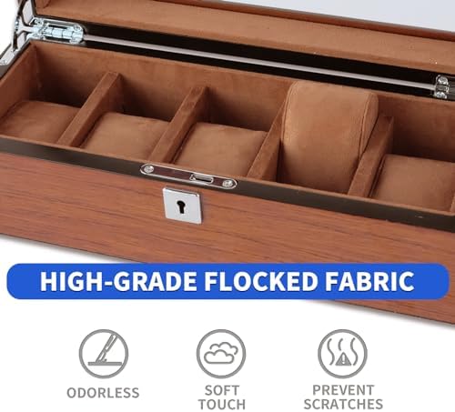 I have a few watch boxes and I'd say this is in the middle upper half in build quality and design.Even though it is made of MDF, it feels heavy and solid - almost made me think it was solid wood.The hardware is polished and installed so that they're parallel and flush to the box's surfaces.The hinges work well and hold the lid up.It took a bit of effort to get the key to lock/unlock; not sure what the issue was but it works fine now.There's only one key, so be careful not to lose it.The internal lining and pillows are a soft and evenly applied.Even the inside of the lid has the lining applied for extra protection.The spaces are large enough to easily accommodate my 42mm and larger watches, even the thicker ones at over 15mm with plenty of space between the watch and lid glass.The bottom has a soft velvet fabric that prevents scratches, but doesn't slide around.The veneer grain is quite realistic and the stain color is consistent and warm.Overall, it's a very nice and capable watch case that easily stores my larger sized watches.The price is reasonable for a 6 slot case.And it came very well protected in the box with a styrofoam liner all around it.But I can't give it a full 5 stars as it is made from MDF with a veneer surface rather than solid woods.